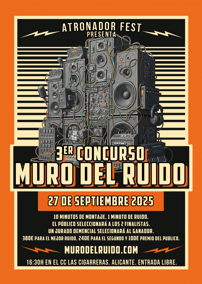 Este año vuelve al Atronador Fest la tercera edición del primer concurso mundial de “Muro del Ruido”, donde se abrirá la participación a los artistas sonoros y músicos para que creen en directo una pieza sonora de 1 minuto de duración, donde cada participante dispondrá de un máximo de 10 minutos para montar sus instrumentos, micrófonos, efectos y utensilios sonoros necesarios para generar su propio muro del ruido de 1 minuto de duración.